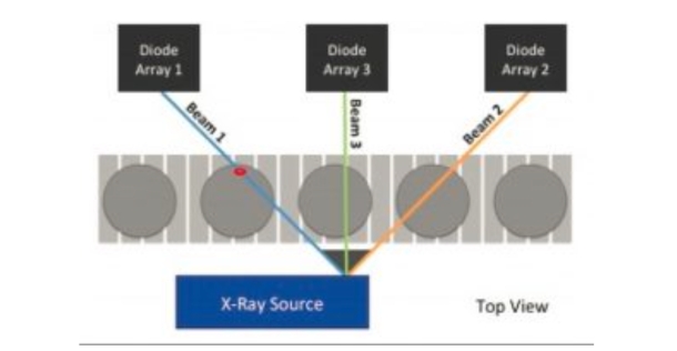 The ScanTrac Trio is designed with three X-ray beams aligned at different angles which provides full inspection coverage of the container.  This is especially important around the punt where glass shards are most likely to fall and become hidden from traditional X-rays.